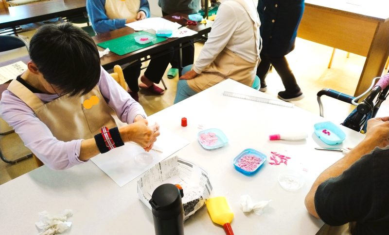 グループホームやサービス付き高齢者向け住宅からお仕事に来ている方もいらっしゃいますし、高齢者施設の清掃作業、販売用の作品制作やお菓子作り行っています。
